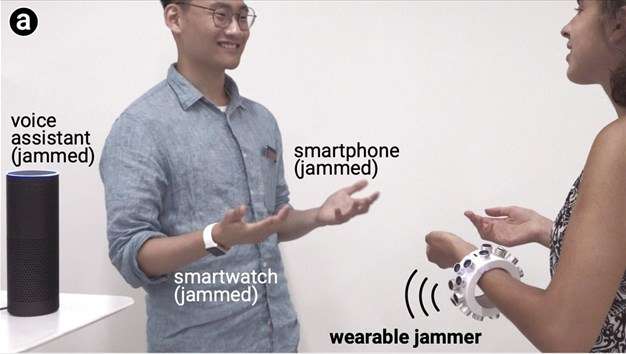© naftemporiki.gr Βραχιόλι- «ασπίδα» απέναντι στα «αδιάκριτα» μικρόφωνα ηλεκτρονικών συσκευών Μία συσκευή-«ασπίδα» απέναντι σε μικρόφωνα που βρίσκονται στο περιβάλλον του χρήστη (περιλαμβανομένων κρυμμένων μικροφώνων) ανέπτυξαν ερευνητές του University of Chicago. Η συσκευή αυτή, που φοριέται στο χέρι, παραπέμποντας σε βραχιόλι, βασίζεται στο γεγονός πως, όταν εκτίθενται σε υπερήχους, τα περισσότερα